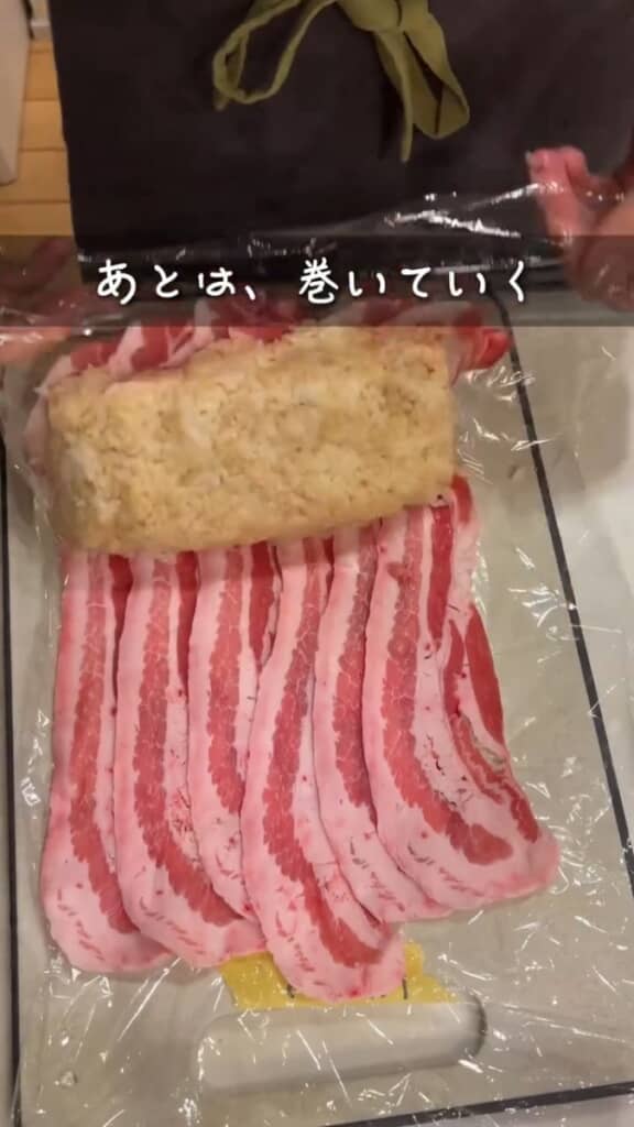 ラップの上に豚バラ肉を広げ、味付けしたごはんを乗せたら、少し丸さを出しながらくるくると巻いていきます。ごはんを乗せたときにある程度成型しておくのがポイントだそう。サイドからごはんが出ないように、両端もしっかりと抑えましょう。