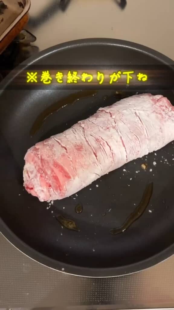 次に、豚バラ肉全体に小麦粉をまぶします。ラップの上でコロコロと転がしながら行えば、洗い物も減らせますね。フライパンに油をひき、豚バラ肉の巻き終わりを下にして焼いていきます。途中で転がしつつ側面にも焼色をつけながら、最後はふたをして蒸し焼きにします。