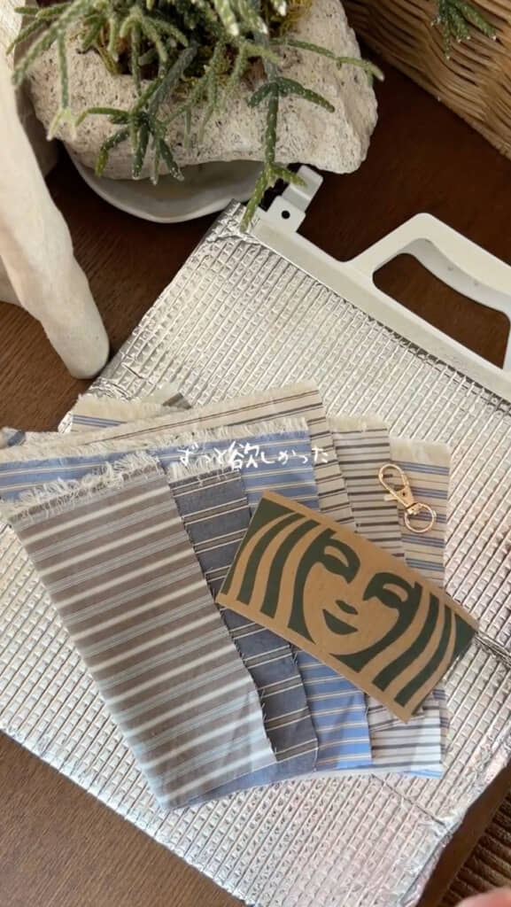 小さな子どもとのお出かけは、両手がふさがるのが不安で、どうしても手軽に飲めるものを選びがち。たばさんもこれまで、水筒を持ち運ぶかペットボトル飲料ばかり選んでいたといいます。そこで今回は余っている保冷バッグとストライプのハギレを使って、前々から欲しかったというドリンクホルダーを作っていきます。