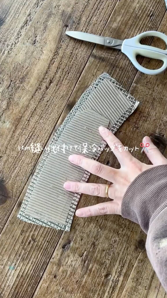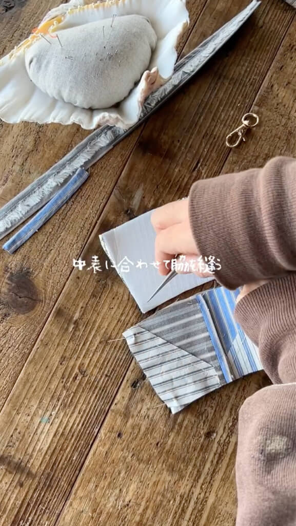 余分な縫い代をカットしたら、生地をアルミシートに合わせて裁断。両方中表に合わせて脇を縫い、生地の表地に持ち手を仮止めしていきます。ちなみに、持ち手は生地の端を利用してフリンジ風にアレンジしたとのこと。