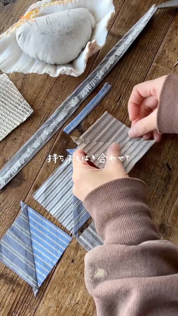 まずは、スターバックスのカップスリーブを切り開き、1センチの縫い代をつけて保冷バッグをカット。ハギレを三角にカットしたら、長方形になるようにパッチワークし、持ち手部分もはぎ合わせていきます。