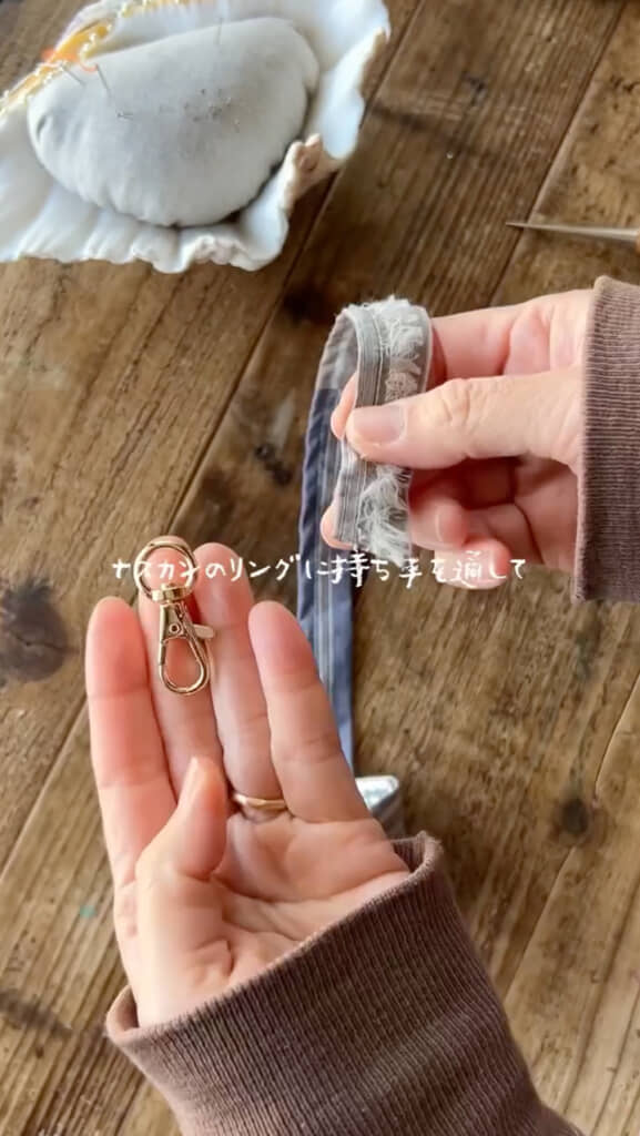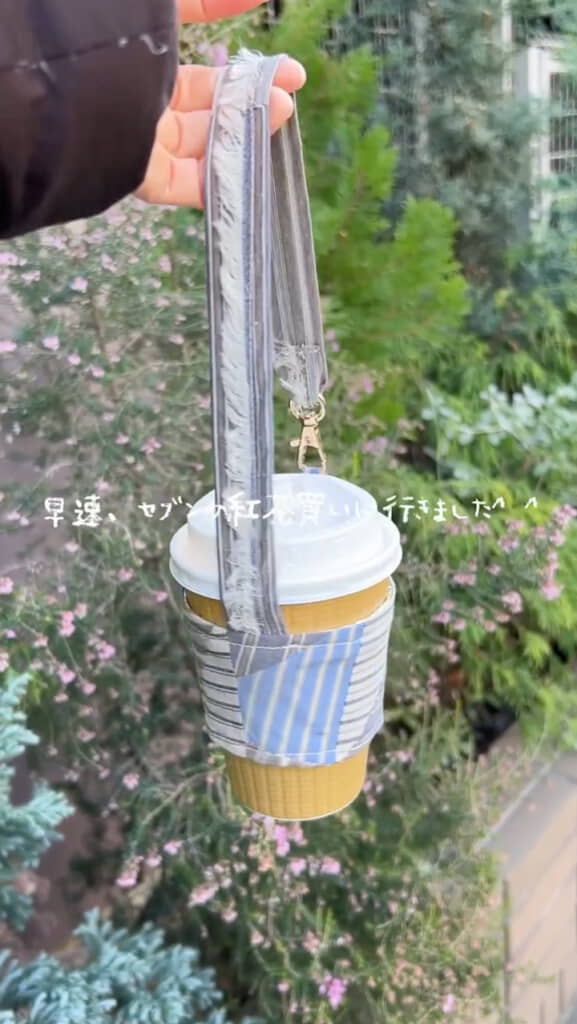 最後にナスカンのリングに持ち手を通して縫い止めたら……ドリンクホルダーが完成です! ストラップ付きなので、ベビーカーや腕に引っ掛けることも出来るため、両手がふさがる心配もありません。さっそくセブンイレブンの紅茶を買って入れてみたところ、サイズもぴったりで使い勝手も良かったそうですよ。