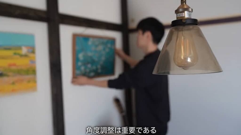 裏面にヒモを付け、壁の開いている部分に設置していきます。角度を慎重に調整して飾ったのは、フィンセント・ファン・ゴッホの名画「花咲くアーモンドの木の枝」(1890年)の複製画。ゴッホが愛する弟のテオに息子が生まれた事を祝って贈った一枚です。