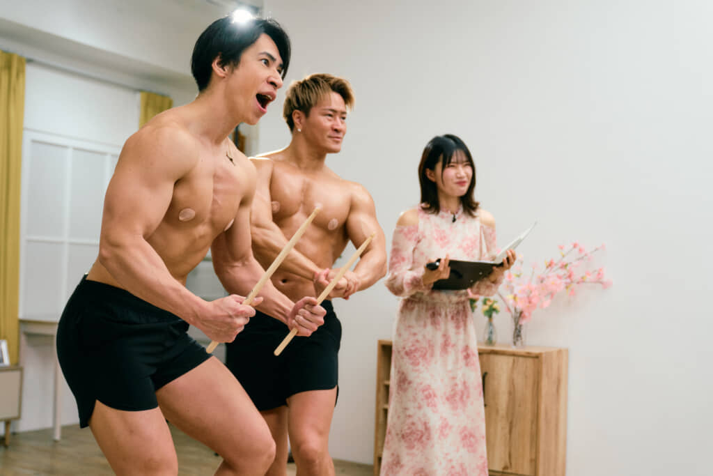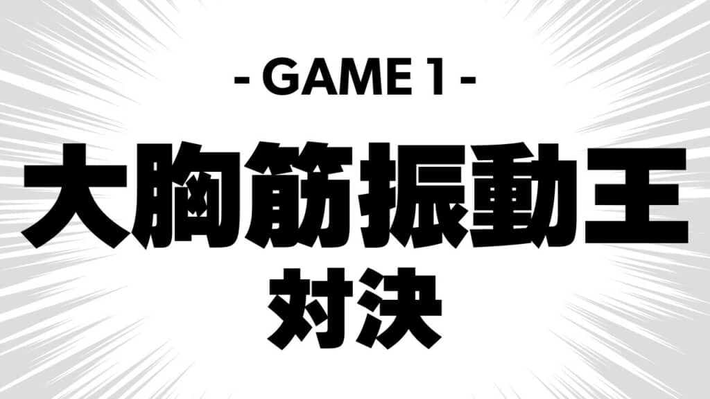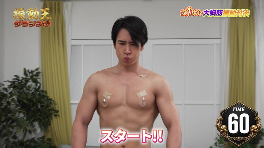 第1試合は「大胸筋振動対決」。大胸筋のピクピクで胸につけた鈴を揺らし、SonoReproを超える振動を起こせればマッチョの勝利となります。
