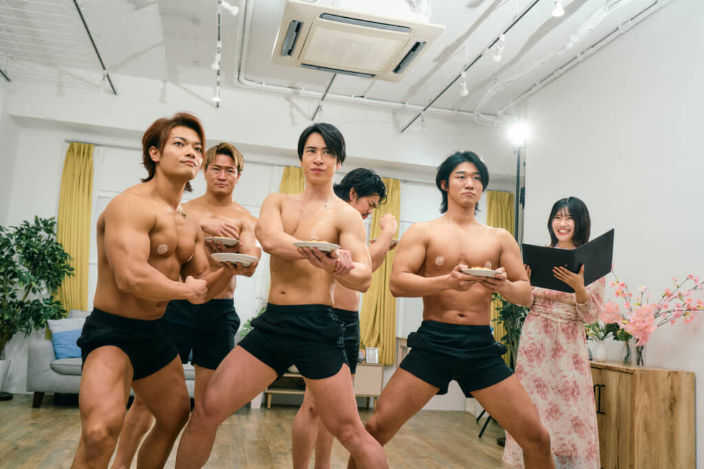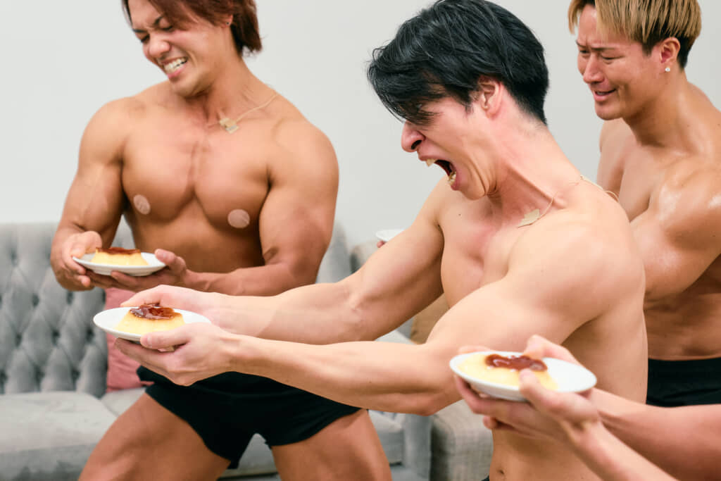 しかし、撮影現場ではプリンに「よくがんばった」と声をかけ、すぐさまプリンを持ってポージングをするマッチョたちの姿がありました。なんで?