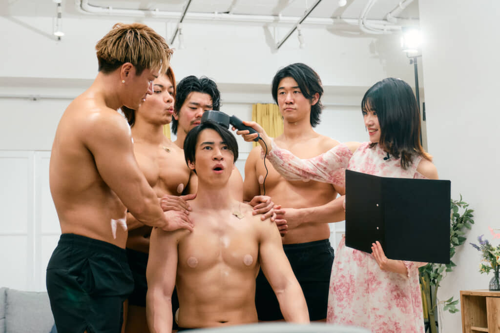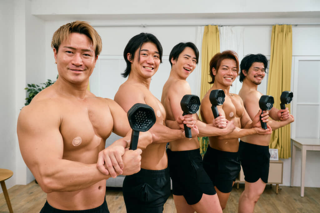 最後はマッチョたちがSonoReproの頭皮ケアを実際に体験してみることに。1秒4万回の振動が、疲れたマッチョたちに降り注ぎます。