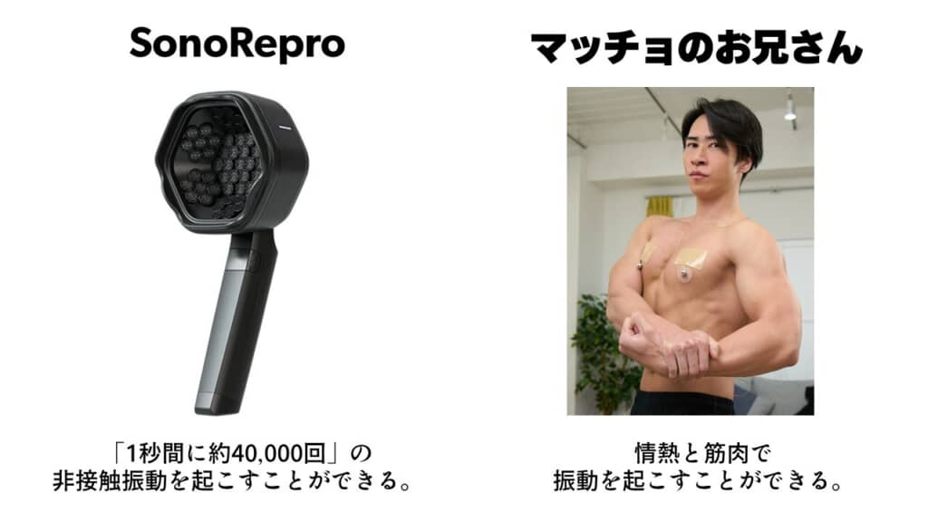 そんなテクノロジーの結晶であるSonoReproの「振動力」に、人類はフィジカルで勝てるのか? というのがこの対決企画のテーマ。正確には対決になっているのか謎なのですが、愚直に己のフィジカルだけを磨き続けてきたマッチョのお兄さんは力強く宣言しました。