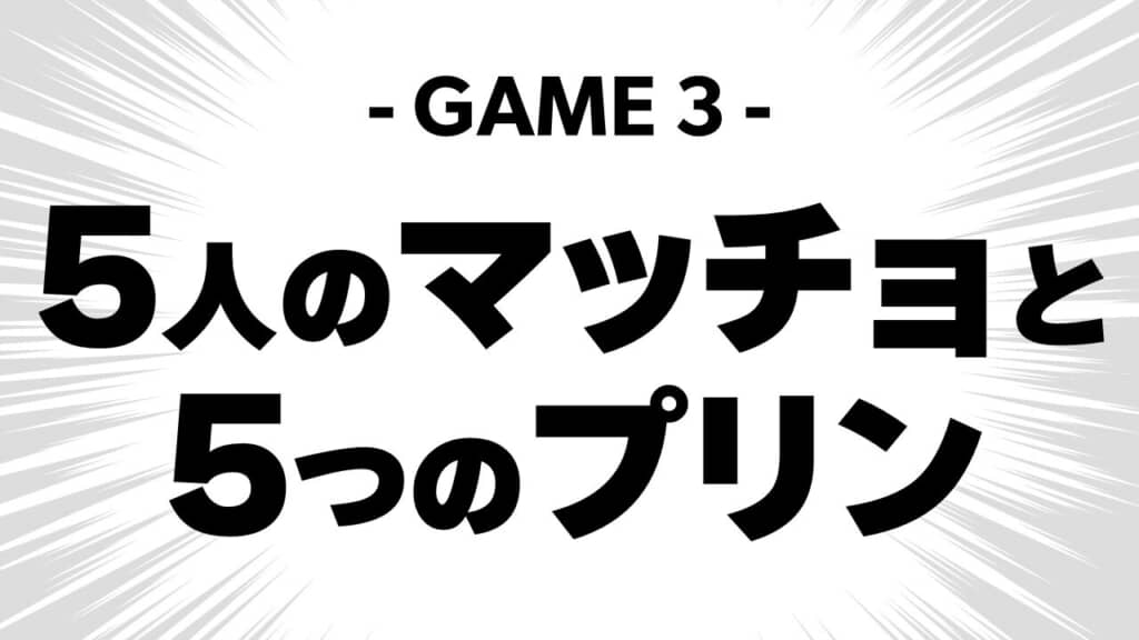 強さと優しさを兼ね備えるマッチョたちは、なぜかプリン側に「膨れてきたよ~」「なんだこのパンプアップは!?」「卵に戻っちゃう」と激励の言葉をかけています。「プリンのパンプアップ」とかいう概念はじめて聞いたよ!