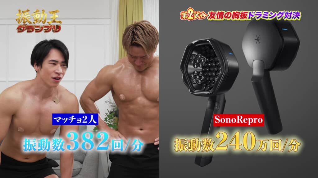 マッチョとSonoReproが対決した「振動王グランプリ」の動画はYouTubeでも公開中。シュールな対決とSonoReproの圧倒的な振動数はぜひ動画でご確認ください。