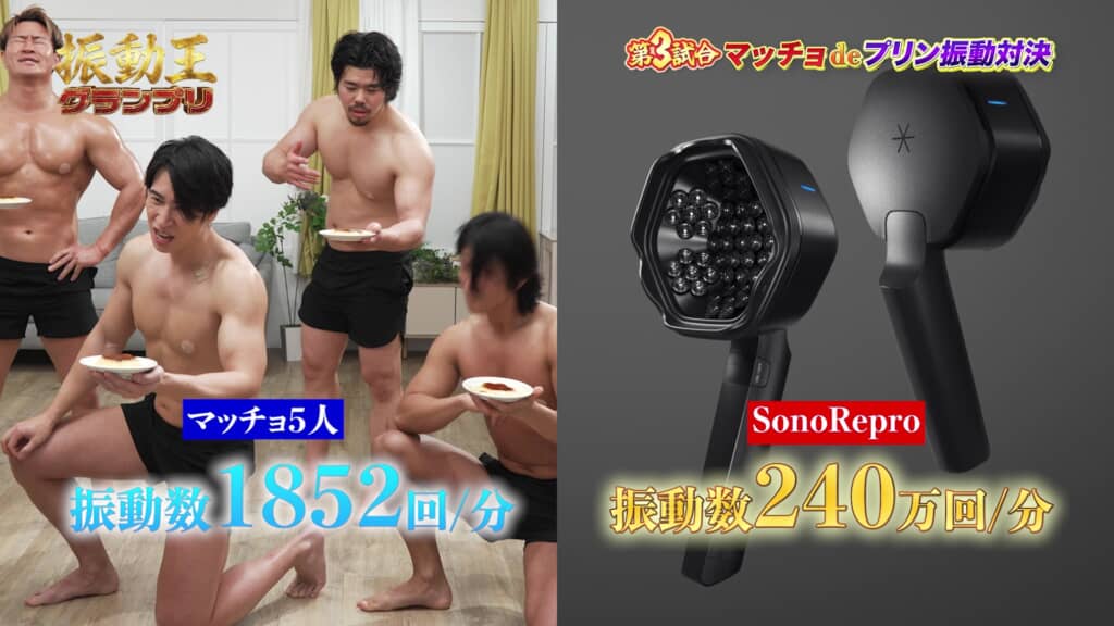 最終試合は計5人のマッチョによる「マッチョdeプリン振動対決」。5人のマッチョがプリンを乗せたお皿を揺らして、5人全員の振動数の合計でSonoRepro超えを目指します。