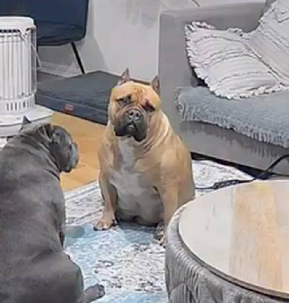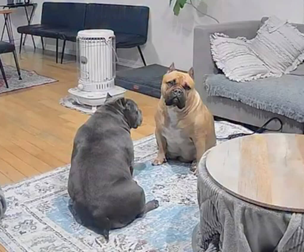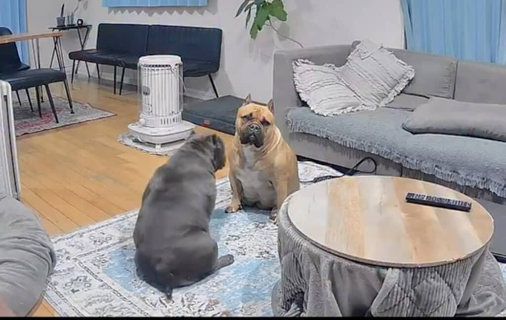 今回の投稿では、飼い主が外出中にふとペットカメラを確認したときの様子を公開しています。カメラに映っていたのは、母犬の「レティ」ちゃんと娘の「ラブ」ちゃん。リビングで向かい合う2匹の姿は、まるでお母さんが娘を呼び止めて“お説教”を始めたかのような空気感です。