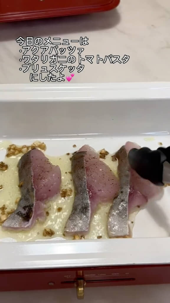 まず作り始めたのはアクアパッツァ。ホットプレートにガーリックオイルを熱し、白身魚の切り身を軽く焼いていきます。ジュワッと香ばしい音が広がり、見ているだけでおなかが空いてきそうです。