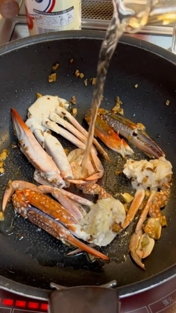続いて作るのはワタリガニのトマトパスタ。ガーリックを熱したフライパンでワタリガニを炒め、白ワインで香り付け。そこへトマト缶を加えて、コクのあるソースを作ります。