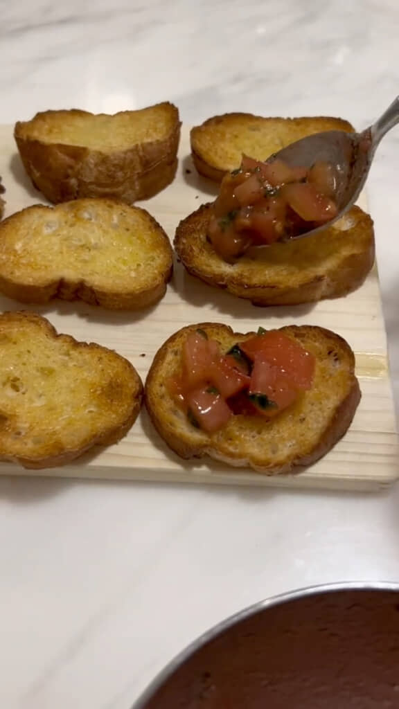 さらに、カットして焼いたフランスパンにトマトやバジルなどをのせたブルスケッタも用意。さっぱりとした味わいで、前菜にもぴったりの一品です。
