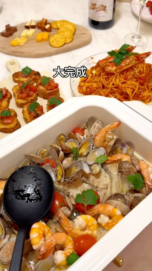 こうして完成したのは、アクアパッツァ、ワタリガニのトマトパスタ、ブルスケッタの豪華メニュー。色鮮やかな料理が並ぶ食卓はとても華やかで、思わず「おいしそう!」と声が出てしまいそうです。友人が持ってきてくれた白ワインにもぴったり合いそうですね。
