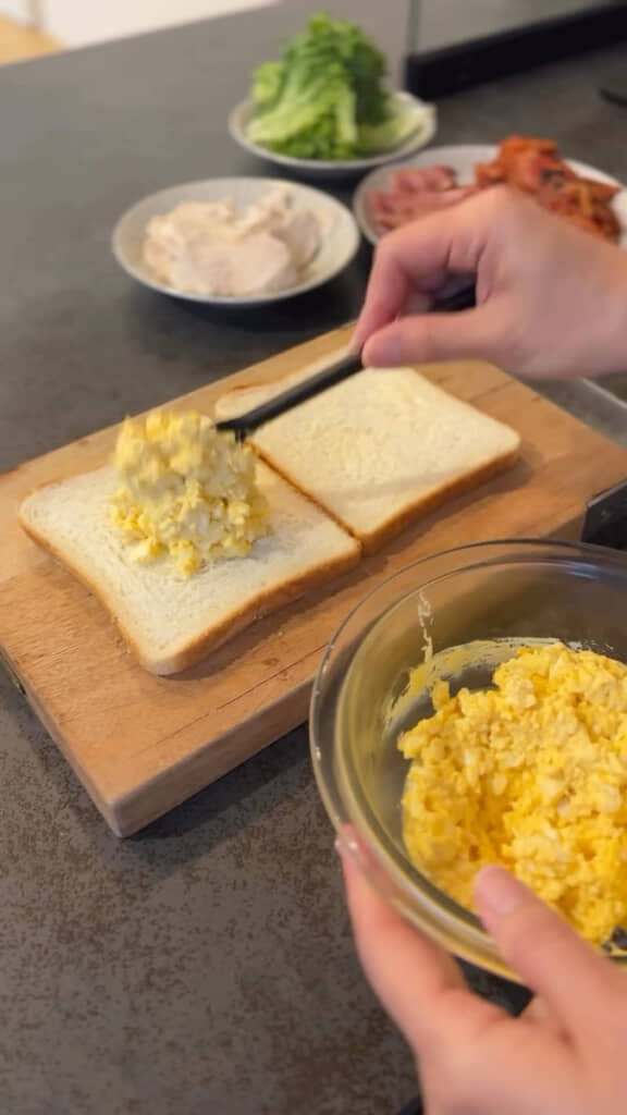 最初に作るのは定番のたまごサンド。バターを塗った食パンに、たまごスプレッドをたっぷりと乗せます。もう1枚の食パンを重ねると、ふわっとボリュームのあるサンドイッチが完成します。