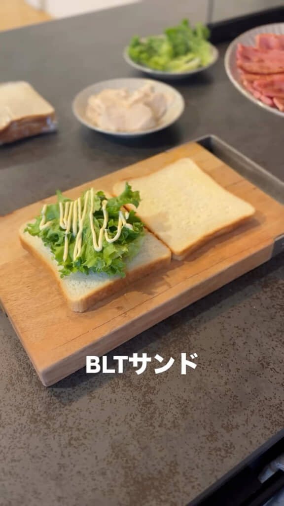 続いて作るのはBLTサンド。シャキッとしたレタスにジューシーなトマト、厚切りベーコンを合わせた食べ応えのありそうな一品です。まずは食パンにバターを塗り、レタスをのせてマヨネーズをかけます。