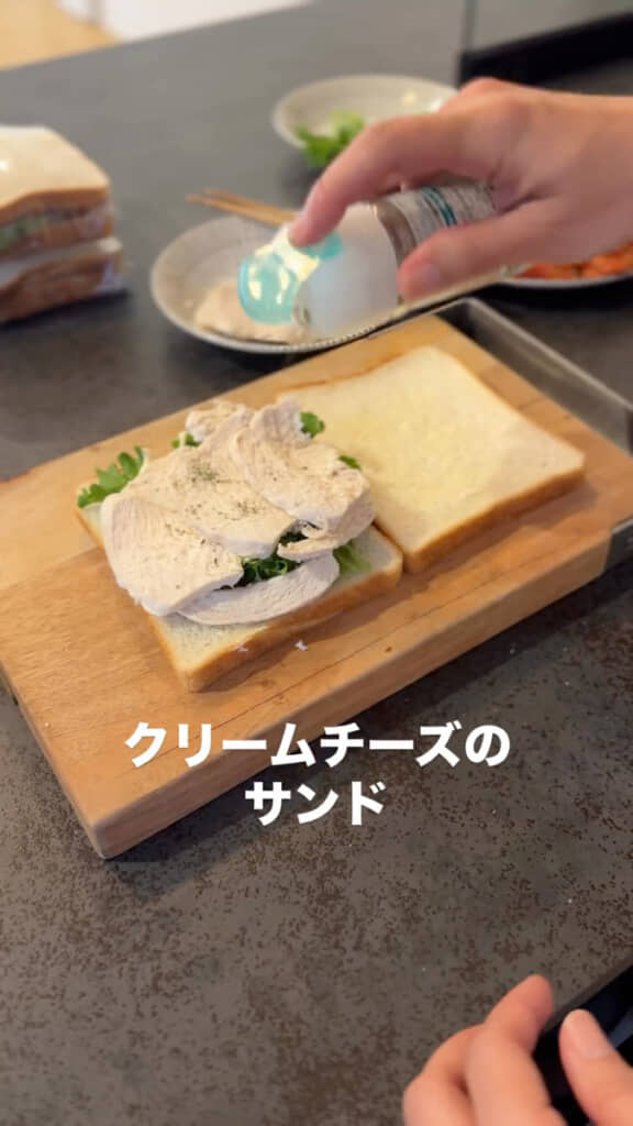 さらに、自家製鶏ハムとクリームチーズのサンドも作ります。レタスとマヨネーズの上に鶏ハムとクリームチーズをのせ、ハーブとペッパーでアクセントをプラス。どれも見るからにおいしそうなサンドイッチですね。