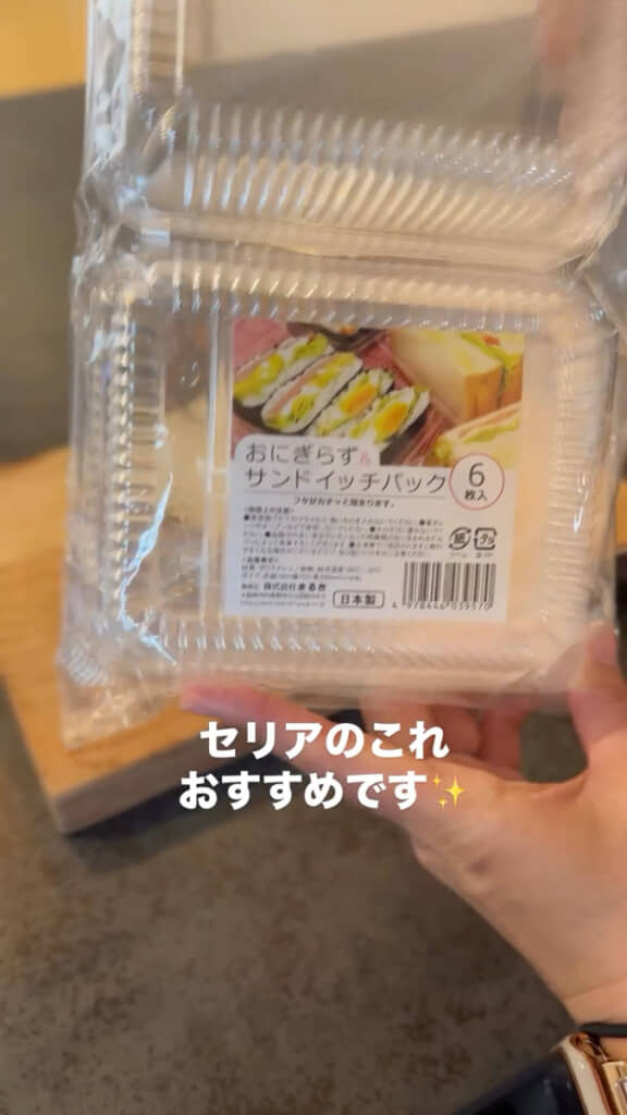sanaさんは動画の中で、お弁当箱として使うおすすめアイテムも紹介してくれています。100円ショップなどで手に入る「おにぎらず&サンドイッチパック」はフタに高さがあるため中身が潰れにくく、普段から愛用しているそうです。今回も、こちらのパックを使用しています。