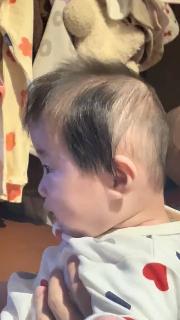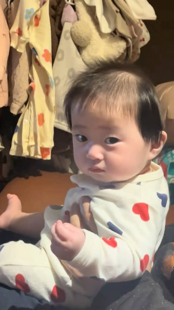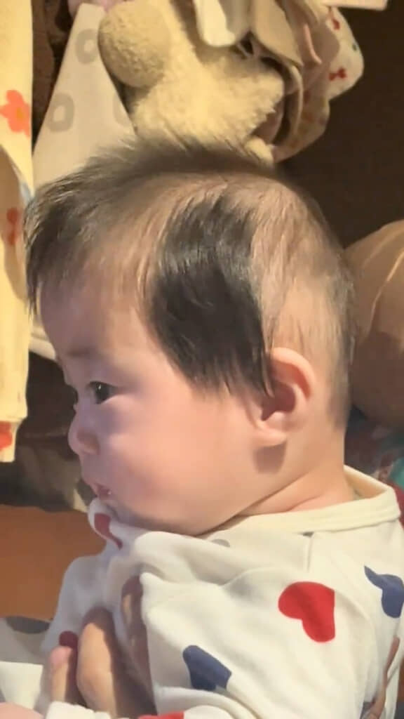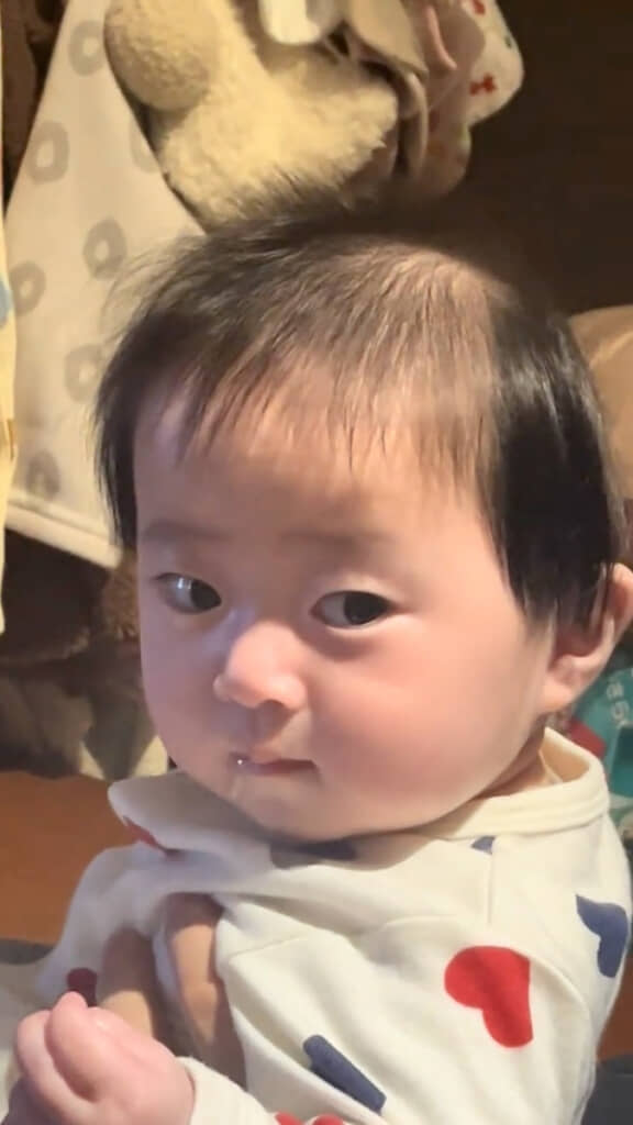 赤ちゃんの髪の生え方は個性豊かで、時には思いがけない形になることもあります。今回のような“横毛ふさふさスタイル”も、赤ちゃんの時期ならではのかわいらしい特徴。見ているだけでほっこりしてしまう姿ですね。