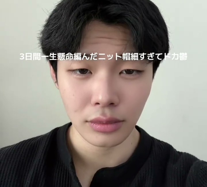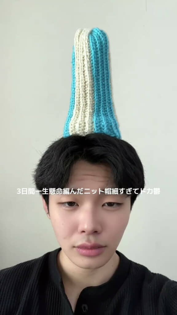 投稿者は、TikTokユーザーのダボハゼ(@user92085383361572)さん。自ら3日間かけてニット帽を作り、実際に着用した姿を披露(ひろう)しています。