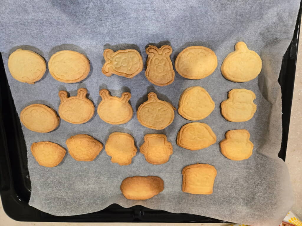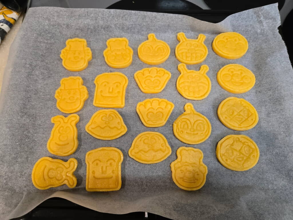 ネットで購入したアンパンマンクッキーの型が届き、娘さんから「アンパンマンクッキーちゅくろ?ちゅくる?」と何度も言われて腰を上げた中澤さん。生地を作り型抜きした状態はとっても良好。きれいにアンパンマンたちの顔が描かれていました。