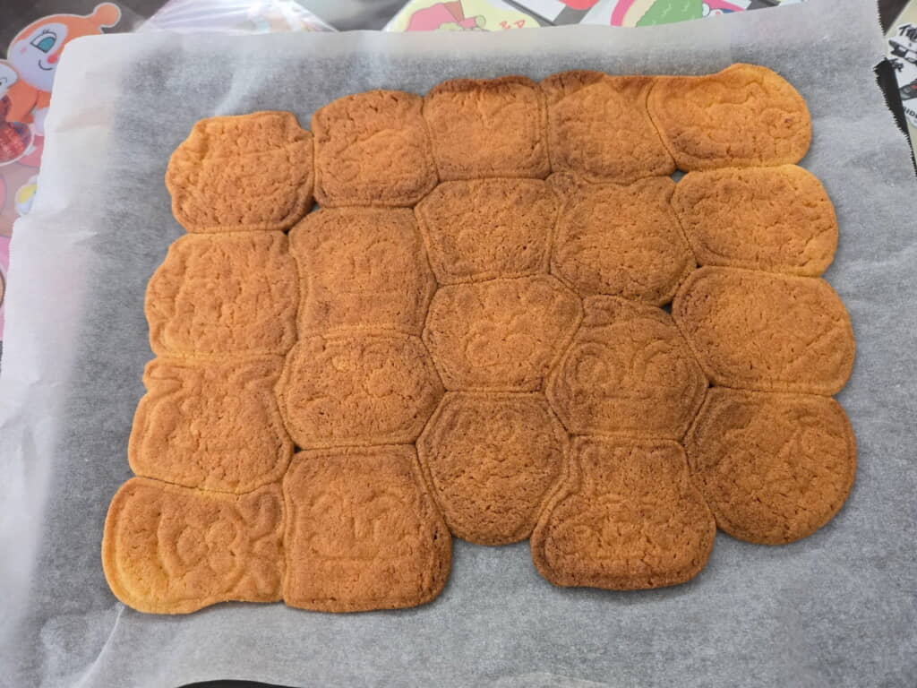 そして焼成してみたら……。なんと全てのクッキーが広がってくっついてしまったのです! 顔はうっすらと見えている状態ですが、娘さんからすると「アンパンマンどっかにいってしまったねー?どこいったー?」と首を傾げてしまうような仕上がりに……。