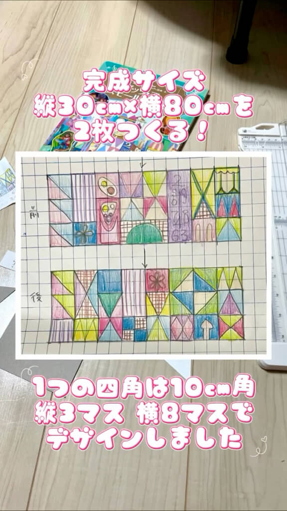 まずは型紙作りからスタート。縦30センチ、横80センチの長方形にデザインを落とし込み、複雑な幾何学模様を線に沿って丁寧に切り取っていきます。こうして前面と背面、計2枚分のパーツを作成しました。