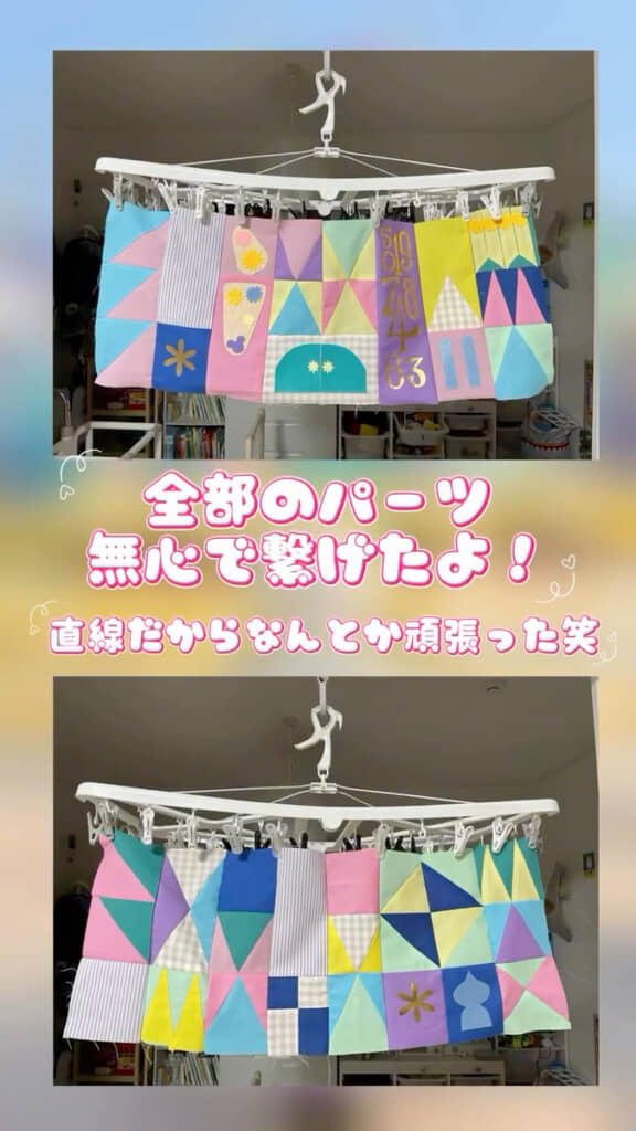 型紙に合わせてカットした布をデザイン通りに縫い合わせていくと……イッツ・ア・スモールワールドの外観そっくりなカラフルなパッチワークが完成。ここからどんな洋服になるのか、期待が高まります。