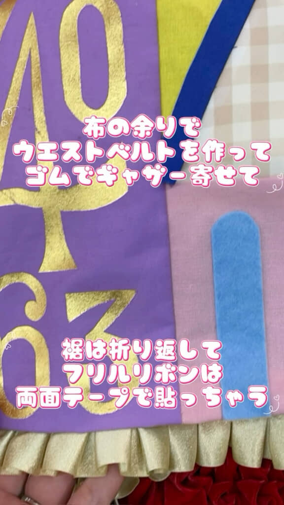 余った布でウエストベルトを作り、ゴムを通してギャザーを寄せると、パッチワークはスカートに。裾を折り返し、フリルリボンを両面テープで貼り付けてかわいらしく仕上げます。