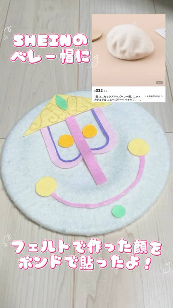 さらに、イッツ・ア・スモールワールドの外観中心にある“顔”の部分は、通販サイトで購入した白いベレー帽を加工して再現。フェルトで顔のパーツを作り、ボンドで貼り付けました。