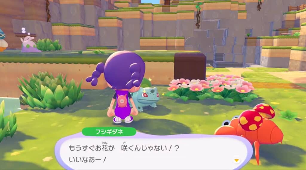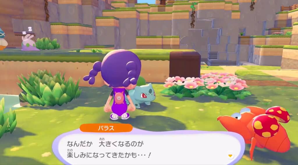 「食べても食べてもお腹が空く」と相談するパラスにフシギダネは「もうすぐ背中に花が咲くんじゃない?」と返事をします。フシギダネは進化すると最終的に「フシギバナ」となり、背中に大きな花が咲くのが特徴。どうやら“背中にキノコを背負ったパラスも同じような進化をたどるのでは”と考えているようです。