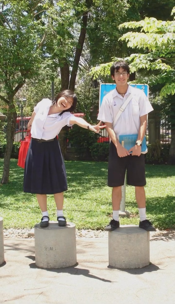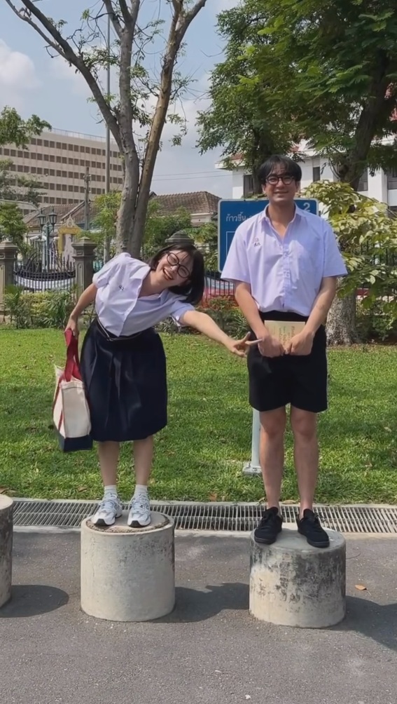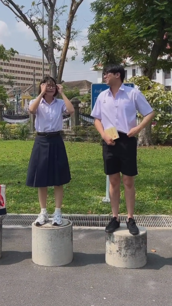 今回紹介するのは、2008年に出会った投稿者さんたちが、18年後の現在に同じ場所と同じポーズ、同じ服装で再現してみた動画です。動画冒頭では、学生服を着用した2人が並んで丸いコンクリート製の台座の上に立っています。場所は緑の多い公園のような場所。背景には青い看板と柵が見えます。投稿者さんはメガネを整えながら、夫である男性と何やら楽しそうに話しています。