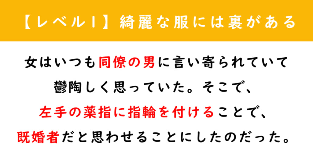 【解答】女はいつも同僚の男に言い寄られていて鬱陶しく思っていた。そこで、左手の薬指に指輪を付けることで、既婚者だと思わせることにしたのだった。