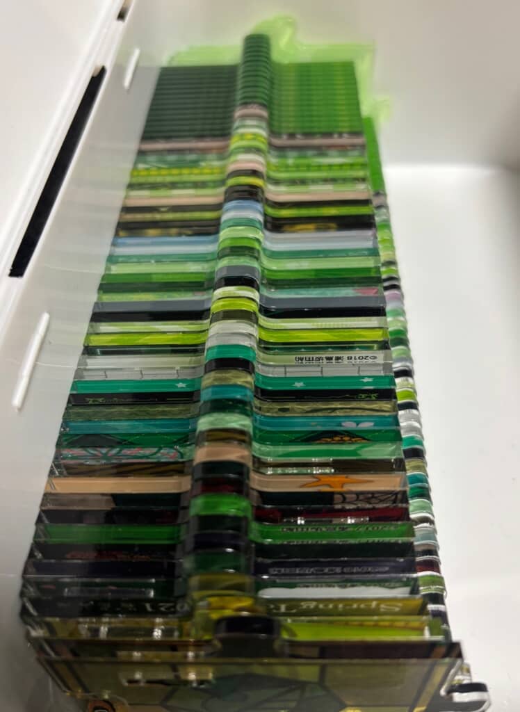 推しのアクリルスタンドをたくさん買い集め、本体ごとに付属する台をきれいに並べて保存していたところ生まれた光景。無数の台がきれいに重なり合い、まるで地層のようになっている。推しとの歴史を感じる1枚だ