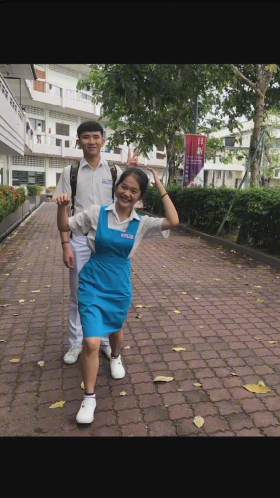 そこから2人はともに歩み始めます。ある写真では、彼女が青い制服のジャンパースカート姿で楽しそうにしています。その後ろを歩く彼は、白いシャツ姿でリュックを背負い、少し照れたような表情でピースサイン。学生カップルらしい無邪気な1枚です。