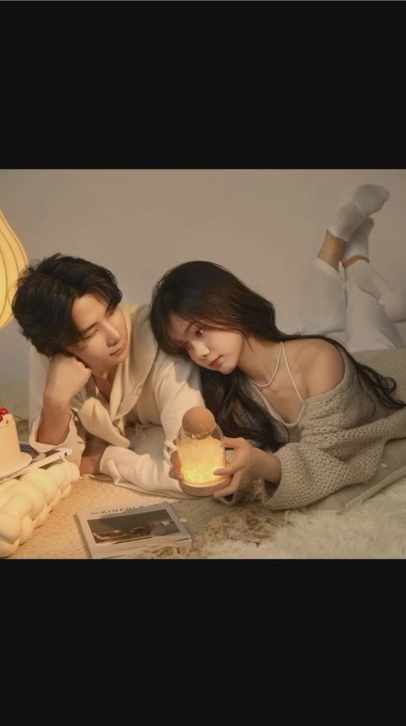 ほかにも、柔らかな照明に包まれた室内で、2人がベッドの上に並んで横になっている写真も。彼女は淡いニットのカーディガンを羽織り、彼も落ち着いたカラーのトップスを着用。2人の間には温かな光を放つランプが配置され、幻想的な雰囲気を演出しています。