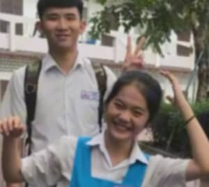 そこから2人はともに歩み始めます。ある写真では、彼女が青い制服のジャンパースカート姿で楽しそうにしています。その後ろを歩く彼は、白いシャツ姿でリュックを背負い、少し照れたような表情でピースサイン。学生カップルらしい無邪気な1枚です。