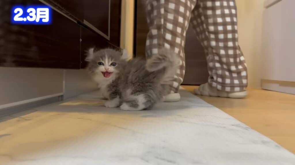 お迎え当初はとっても小さかったししゃもちゃん。好奇心旺盛で家の中を歩き回り、おもちゃで遊ぶこともすぐに覚えたそうです。このころから食いしん坊な片鱗を見せており、ごはんのときは元気いっぱいに鳴いてアピールをしていました。