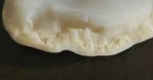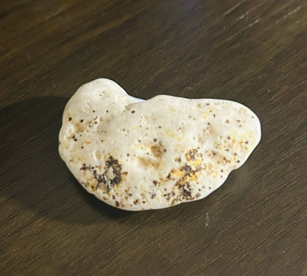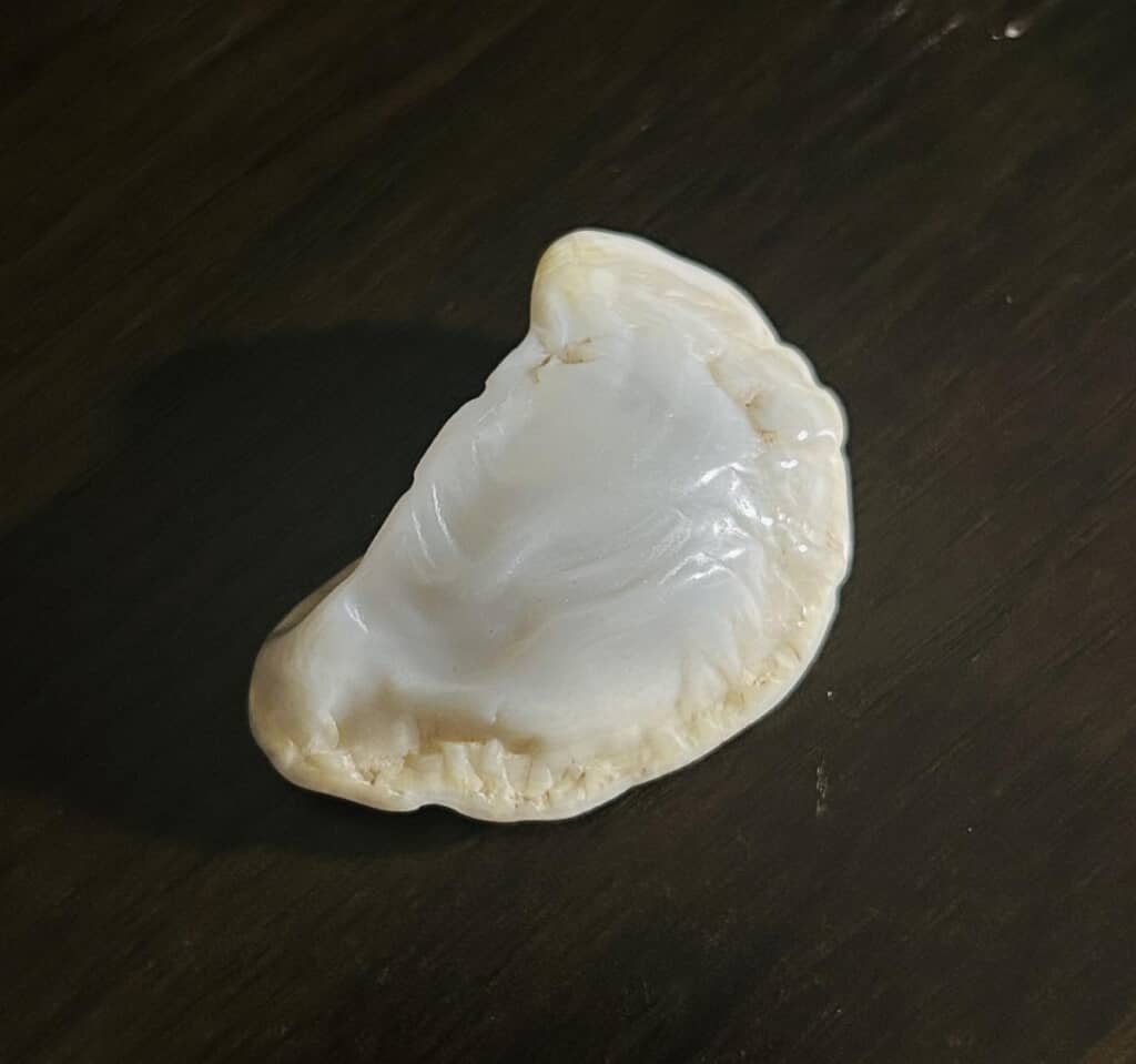 写っているのは半透明の白い石。よく見ると中央に少しふくらみがあり、外側はヒダのようになっていて、見れば見るほど「餃子」のような形をしています。