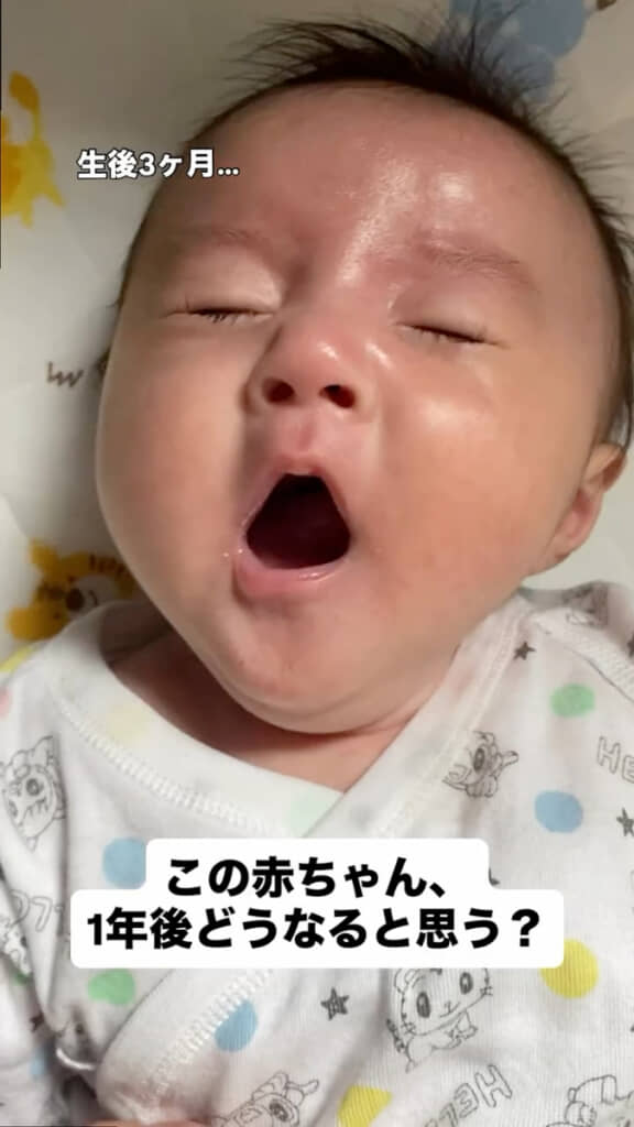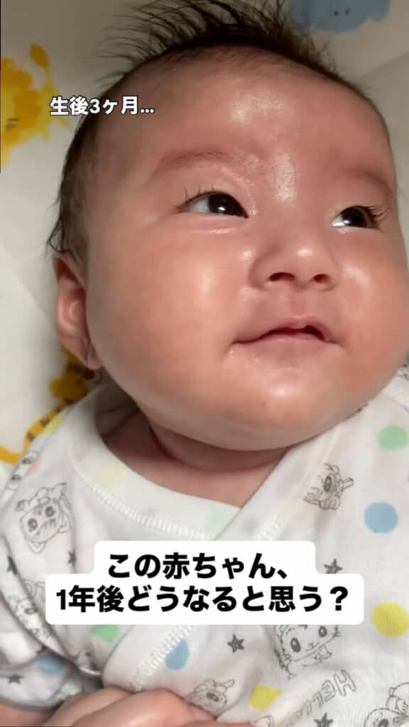 今回の動画の主役は息子のふーちゃん。生後3カ月ごろの姿は色黒でぽっちゃりとした、ママさんいわく「どすこい赤ちゃん」だったといいます。一重まぶたのまんまるとしたお顔が、なんとも愛らしい雰囲気を漂わせていました。