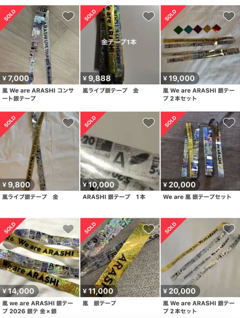 「ARASHI LIVE TOUR 2026」などと記された記念テープは、平均的に1本約1万円~2万円前後、中には4万円近くで売買されているケースも確認されています。