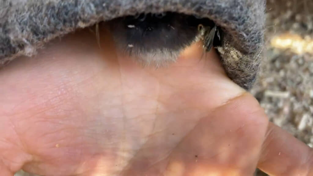 手の平に収まるサイズ感の小さなひよこ。友達さんが着ていた服がふわふわした素材だったからか、“やすらげる暖かい場所”と思って飛び込んだかもしれませんね。
