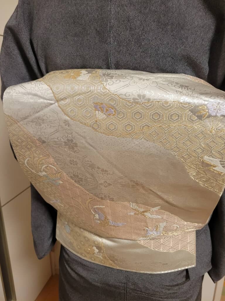 )着物で卒業式に参加した投稿者さん。落ち着いたダークグレーの着物に白と金の淡い色合いの帯を合わせています