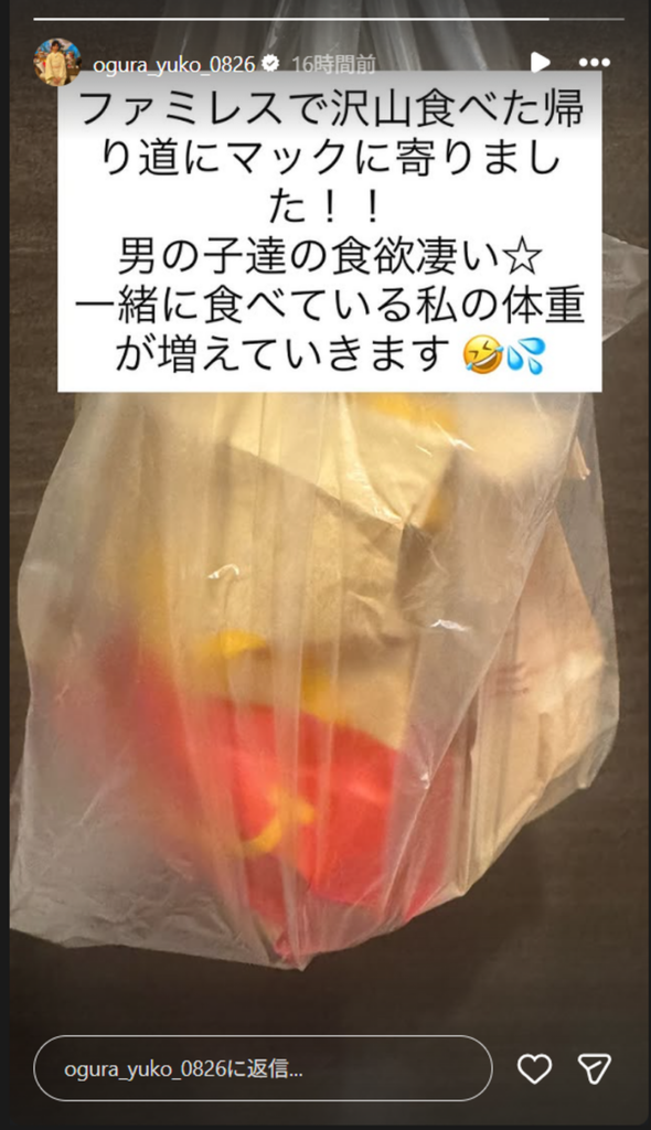 Instagramストーリーズに投稿された光景には、小倉さんがファミレス帰りに購入したマクドナルドの商品が掲載されています。「ファミレスで沢山食べた帰り道にマックに寄りました!! 男の子達の食欲凄い(星マーク)一緒に食べている私の体重が増えていきます」とつづり、ファミレスでおおいに楽しんだあとに大きな袋に入ったマクドナルドメニューを楽しむ予定だと示唆。ギャップがすてき!