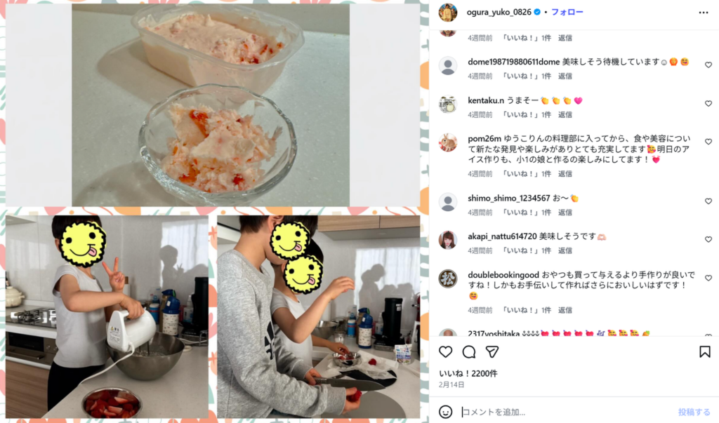小倉さんは過去にも子どもたちと「いちごヨーグルトアイス」など手の込んだおやつ作りにいそしむ様子などを公開。料理作りの様子を生配信することもあるそうで「ゆうこりんみたいなママやったら、ウチの娘も料理上手になってたかなぁ」「ゆうこりんの料理部に入ってから、食や美容について新たな発見や楽しみがありとても充実してます 明日のアイス作りも、小1の娘と作るの楽しみにしてます!」など、多くの子育てママからの支持を集めています。