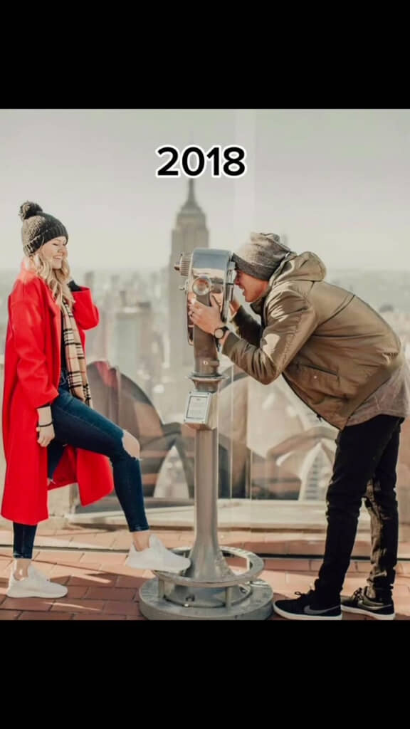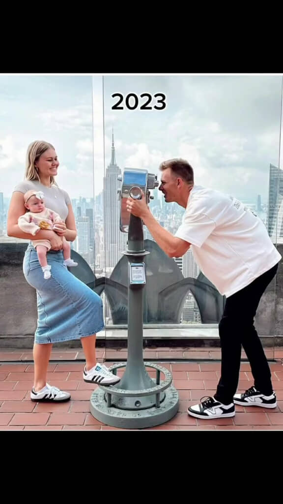 話題になった動画は、ニューヨークの観光地「トップ オブ ザ ロック」で数年ごとに同じ構図で写真を撮り、2人の間に起きた変化を比較するもの。まずは約8年前の2018年に撮った写真が映し出され、展望デッキの望遠鏡で、ダリンさんがベラさんをのぞいている様子がわかります。