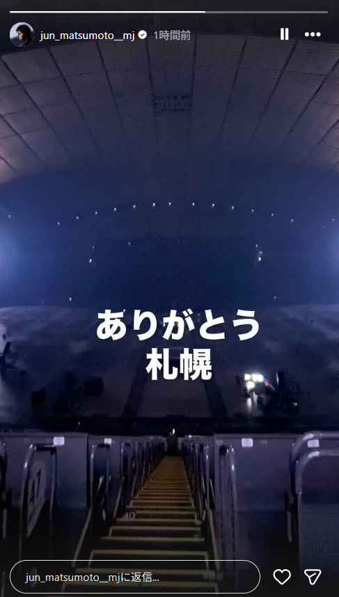 人気グループ「嵐」松本潤さんが3月16日、Instagramストーリーズを更新。13日から15日まで北海道で開催したライブツアー『ARASHI LIVE TOUR 2026 「We are ARASHI」』を終えたこの日、写真を添えてメッセージを送りました。