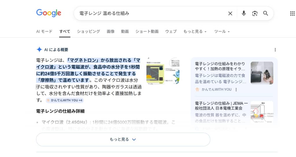 Googleで「電子レンジ 温める仕組み」で検索した結果画面