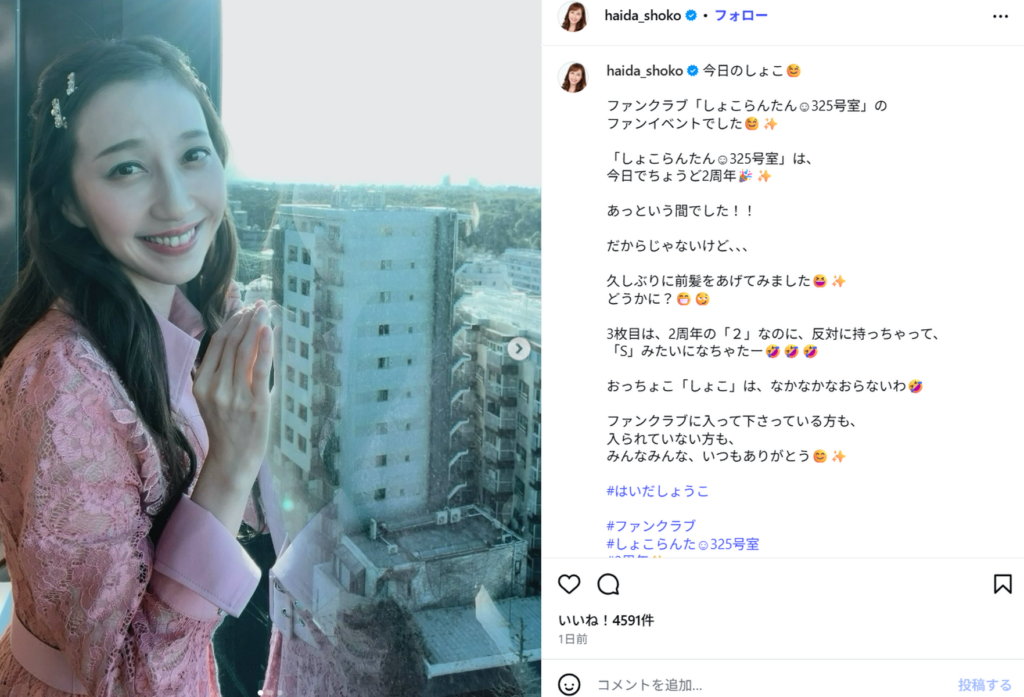 Instagramに投稿された写真には、はいだしょうこさんがどこかの建物の高層階と思われる窓際でやさしくほほ笑む姿が。その姿は見慣れたいつもの様子と少し違って……? はいださんは「ファンクラブ『しょこらんたん(ニコニコマーク)325号室』のファンイベントでした」「『しょこらんたん(ニコニコマーク)325号室』は、今日でちょうど2周年」「あっという間でした!!」とつづり、15日でファンクラブが2周年を迎えたことを報告。